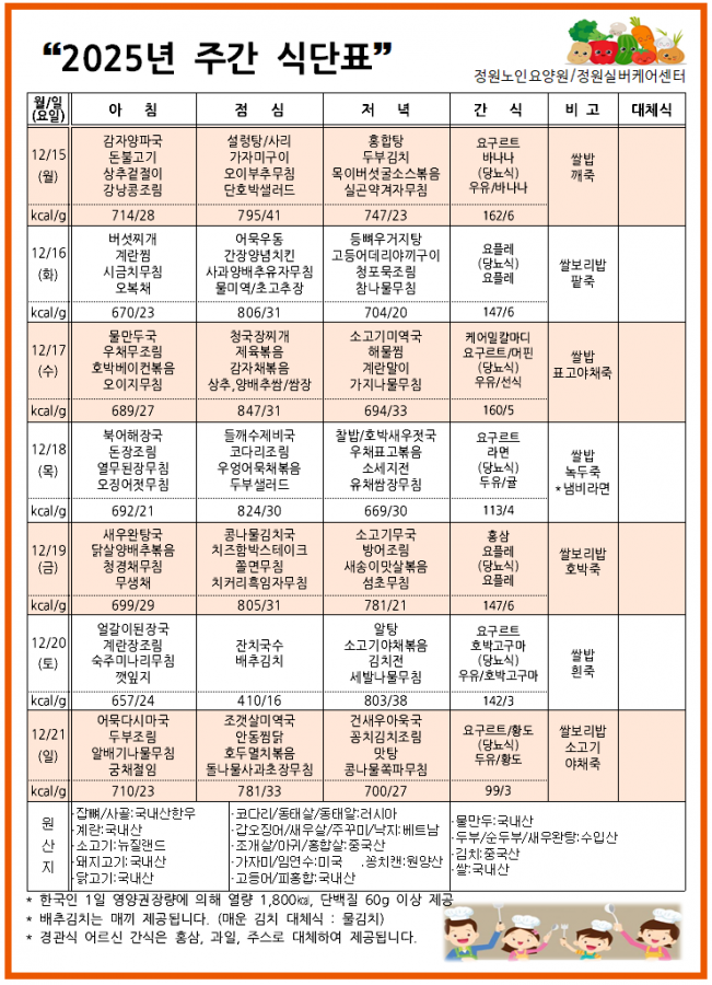 2025년 12월 3주 식단표 페이지 정보 작성자 관리자 댓글 0건 조회 65회 작성일 25-12-15 17:06 목록 본문 2025년 12월 3주 식단표입니다. 이전글2025년 12월 4주 식단표 25.12.19 다음글2025년 12월 2주 식단표 25.12.08 댓글 0 댓글목록 등록된 댓글이 없습니다.