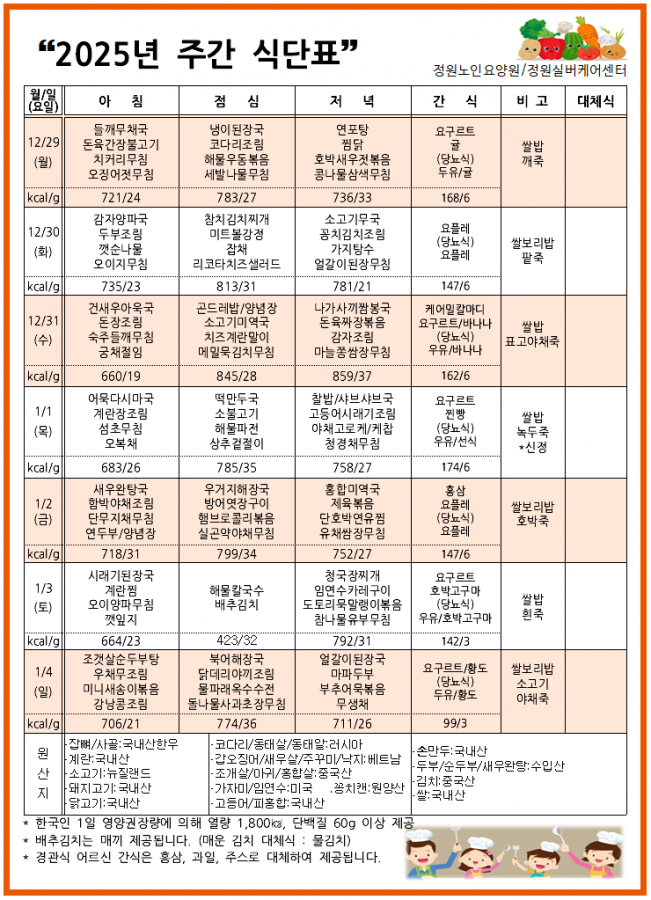 2025년 12월 5주 식단표 페이지 정보 작성자 관리자 댓글 0건 조회 78회 작성일 25-12-24 14:27 목록 본문 2025년 12월 5주 식단표입니다. 이전글2026년 1월 1주 식단표 26.01.02 다음글2025년 12월 4주 식단표 25.12.19 댓글 0 댓글목록 등록된 댓글이 없습니다.